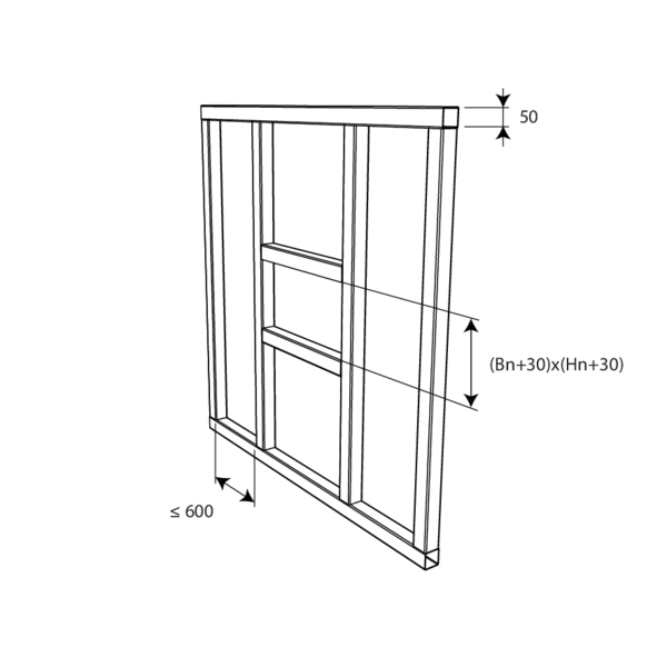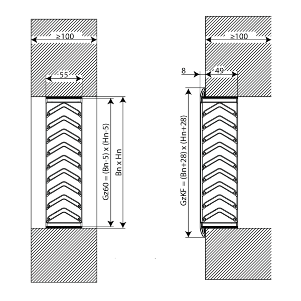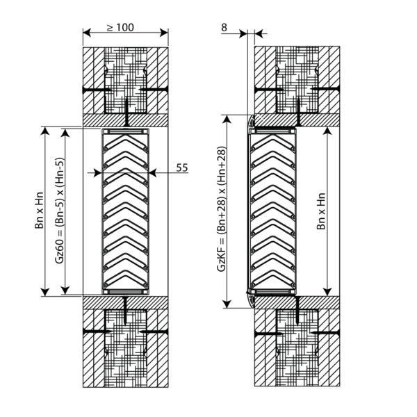 Rohdichte ρ ≥ 500 kg/m³; Tragkonstruktion d ≥ 100 mm | EI 60 (ho i o) | Nicht zutreffend | Art der Installation: Einbau, | 100x100 mm ≤ GZ60 ≤ 800x400 mm
