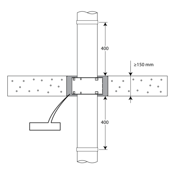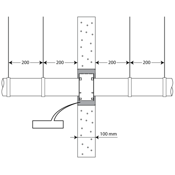 • Die Abstützung der Rohre ist notwendig, um die Funktionstüchtigkeit der Abdichtung im Brandfall zu gewährleisten. Die Rohre sollten nach den allgemein anerkannten Regeln der Technik abgestützt und befestigt werden. Bitte beachten Sie hierzu die Anweisungen des Rohrherstellers.