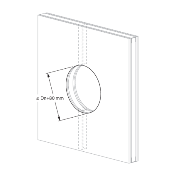 - Metal studs gypsum plasterboard Type F (EN 520) ≥ 80 mm | EI 60 (ve i o) S - (300 Pa) | Fire resistant acrylic sealant | Type of installation: remote from the wall, 0-360° | Ø 100-630 mm