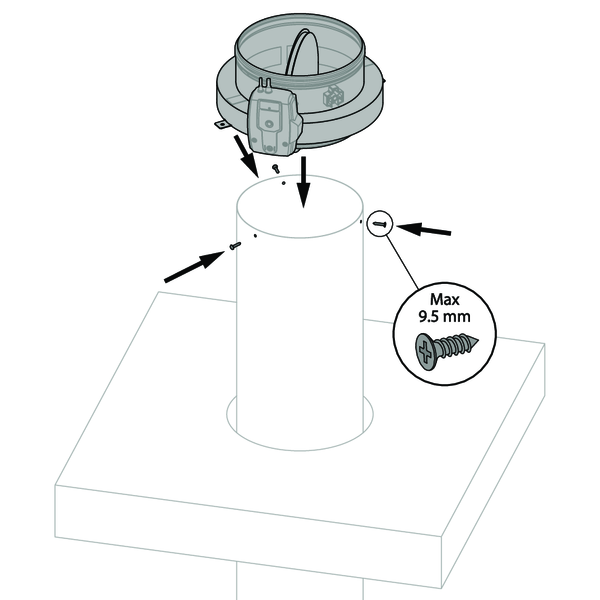 - It is not required to fix the duct to the fire damper with screws, but it is allowed. The screws may be inserted through the rubber sealing ring. Maximum screw length 9.5mm.