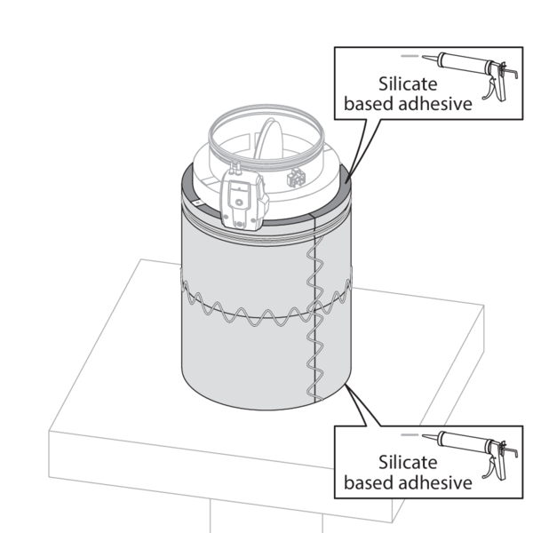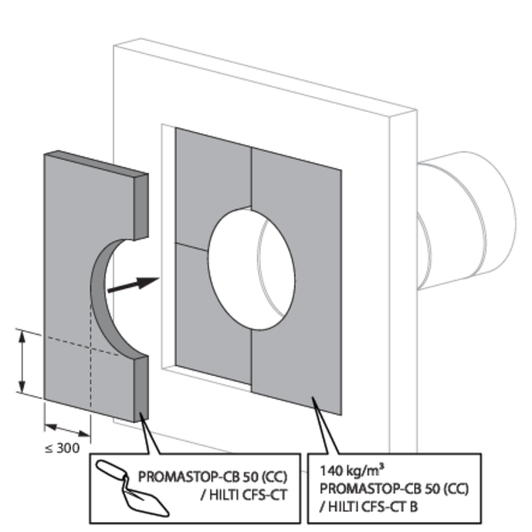 - Aerated concrete ≥ 100 mm | EI 60 (ve i o) S - (300 Pa) | Stone wool + coating ≥ 140 kg/m³ | Type of installation: surface-mounted, 0-360° (300 Pa) | Ø 100-630 mm