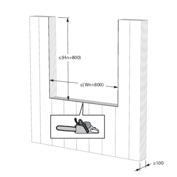 Build the shaftwall acc. to British Gypsum construction details. Create the opening in the wall between the studs or by bridging studs. Mind tolerances in the thickness of the British Gypsum Fireline boards when dimensioning the wall opening. Finished wall opening incl. lining to measure (Wn+65) x (Hn+65).