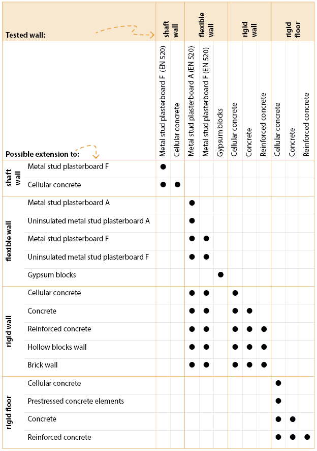 - a flexible wall without insulation between the plasterboards, even if the test was carried out with an insulated wall. Here again, the non-insulated wall should have at least the same fire resistance as the tested wall.