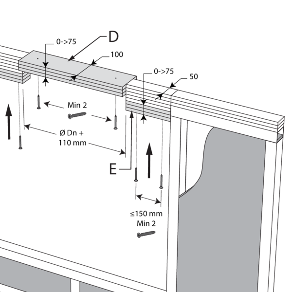 For flexible walls, provide horizontal and vertical studs around the opening. Exception: for fire resistance EI60S/EI90S and if sealing with Promastop or Hilti type boards, it is not necessary, from a fire technical point of view, to provide studs around the opening.