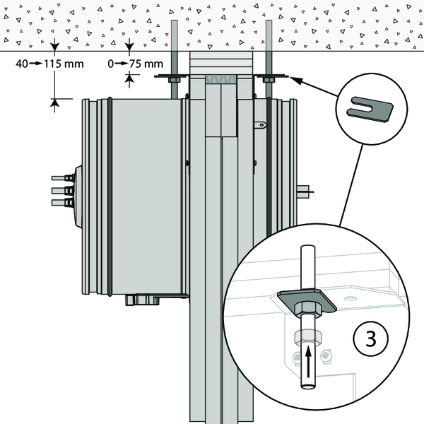 Leave an opening of Dn + 110 mm to accommodate the fire damper. Attach 4 threaded rods (diameter ≥ 8 mm) to the ceiling at a distance of Dn + 8 mm. The distance of the rods to the center of the wall is 76 mm.