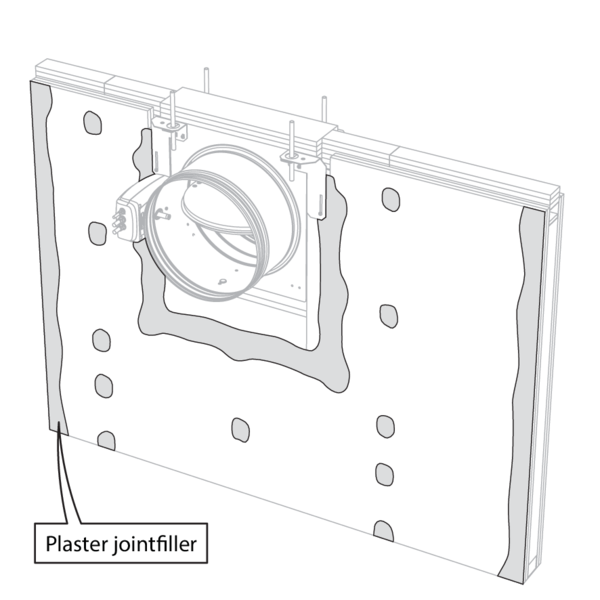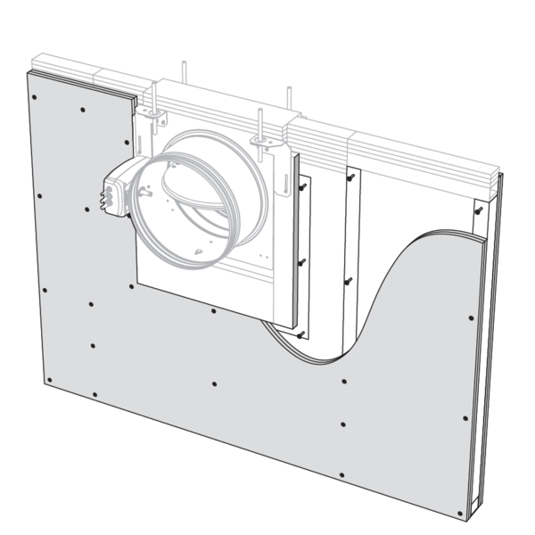 If the fire damper with GDA is to be mounted at a distance from the ceiling, add layers of fire-resistant gypsum plasterboards (type F) to reach a maximum distance of 75 mm from the ceiling: ‘D’ boards in the opening, with a depth of 100 mm, and ‘E’ boards in the remaining width of the opening, with a depth of 50 mm.