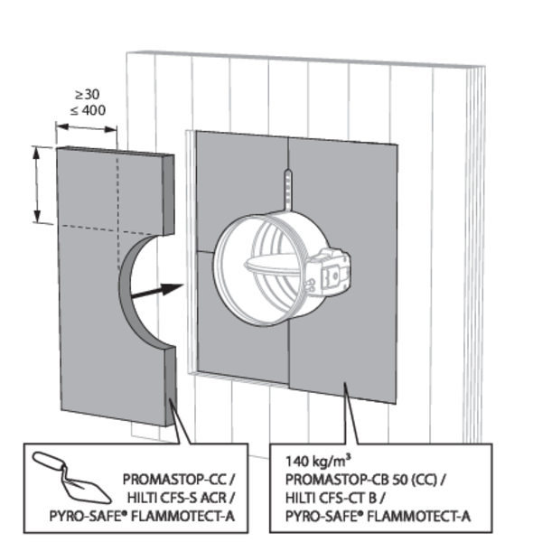 The opening around the duct is sealed with stone wool plates type Promastop CB(/CC) / Hilti CFS-CT B (“G”). The edges are sealed and maintained in place with PROMASTOP-CC / HILTI CFS-S ACR coating.