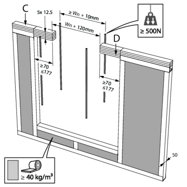 For a flexible wall, provide horizontal and vertical studs around the opening. Exception: for fire resistance EI60S and if sealing with Promastop or Hilti type boards, it is not necessary, from a fire technical point of view, to provide studs around the opening.