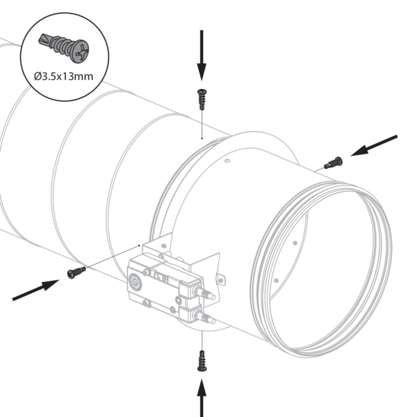 Screw the damper using 4 Ø 3.5 mm screws through the wall of the damper and the smoke control duct.