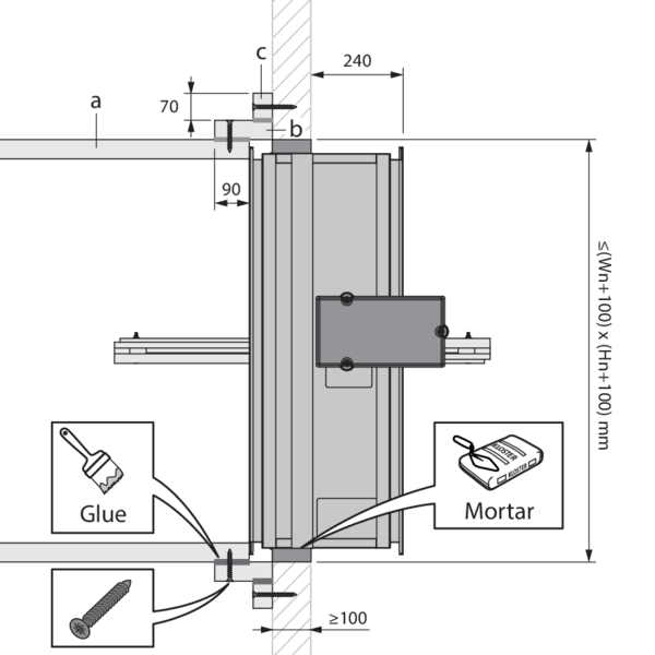 Place the smoke control duct (a) against the flange of the damper. A frame (b), made of the same material, connects the duct to the wall. This frame has an overlap on the duct of at least 90 mm. Fix the frame to the duct using screws (ø5x90 mm) every 150 mm and matching duct glue. A second frame (c) 70 mm high, made of the same duct material, is screwed to the wall with screws suitable for that application.