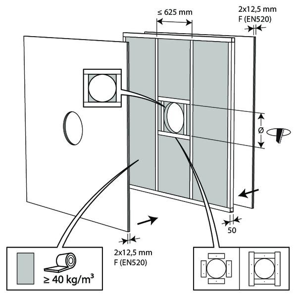 Dans la réservation autour des clapets (Dn + 50 mm), le vide entre les plaques de plâtre cartonné est rempli de laine de roche d’une densité minimale de 40 kg/m³.