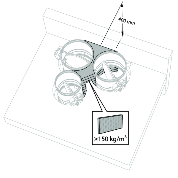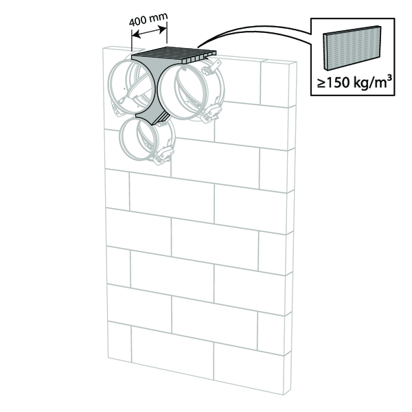 Colmatez la réservation du côté des distances minimales à l’aide de panneaux rigides de laine de roche (≥ 150 kg/m³) sur une profondeur de 400 mm (150 mm du côté mécanique de la paroi).