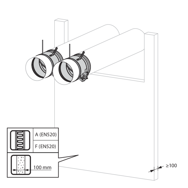 - Ossature métallique et plaques de plâtre Type F (EN 520) ≥ 100 mm | EI 120 (ve i o) S - (300 Pa) | Panneaux de laine de roche + enduit ≥ 140 kg/m³ + enduit sur tunnel | Type de pose : encastré, 0-360°. Distances minimales autorisées avec axe jusqu'à 45°. | Ø 100-315 mm
