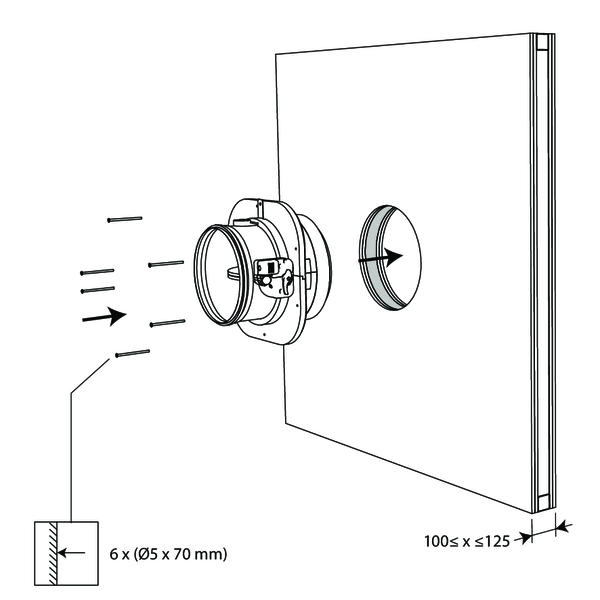 - Béton cellulaire ≥ 100 mm | EI 90 (ve i o) S - (300 Pa) | Panneaux de laine de roche + enduit ≥ 140 kg/m³ | Type de pose : encastré, 0-360°. Distances minimales autorisées avec axe jusqu'à 45°. | Ø 100-315 mm