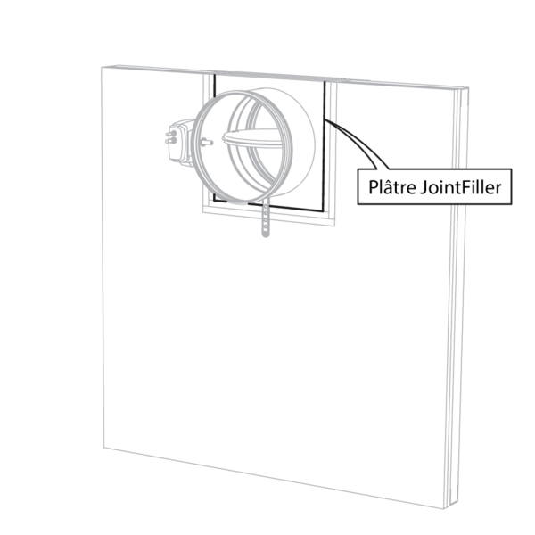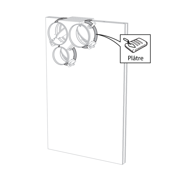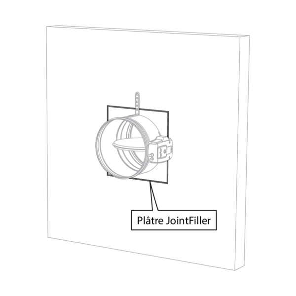 Dans la réservation autour des clapets, le vide entre les plaques de plâtre est partiellement rempli (jusque Dn + 80 mm) de laine de roche d’une densité minimale de 40 kg/m³.