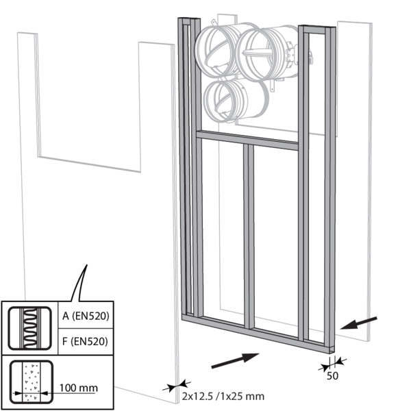 - Ossature métallique et plaques de plâtre Type F (EN 520) ≥ 100 mm | EI 90 (ve i o) S - (300 Pa) | Gaine galvanisé + panneaux de laine de roche + enduit ≥ 140 kg/m³ 2x50 mm | Type de pose : pose déportée, 0/180°. Distances minimales autorisées. | Ø 100-315 mm