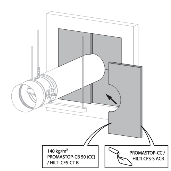 La réservation autour de la gaine dans la paroi est remplie par une épaisseur de panneaux de laine de roche de type Promastop CB(/CC) / Hilti CFS-CT B « G » revêtus sur les chants d’enduit PROMASTOP-CC / HILTI CFS-S ACR permettant leur fixation.