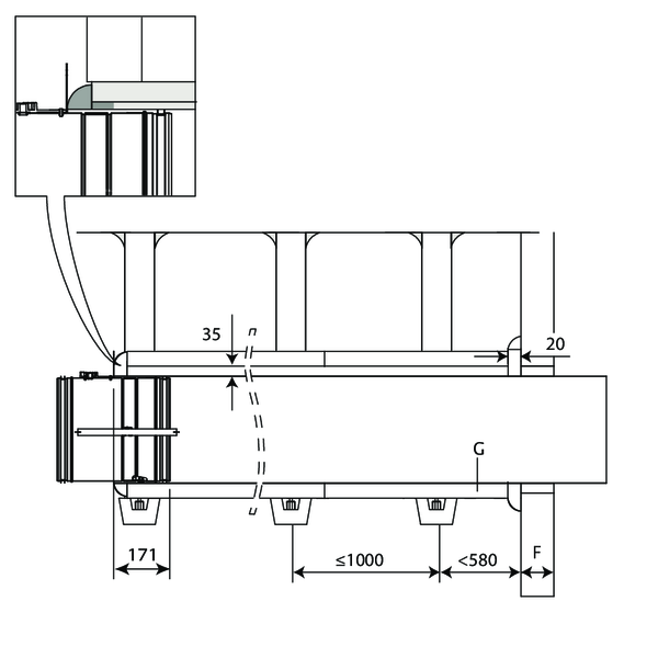 Les suspentes sont composées de tiges filetées « C » et de rails de supportage « D ». Une distance d’environ 25 mm est respectée entre les tiges filetées et les faces verticales du gaine « B ».
