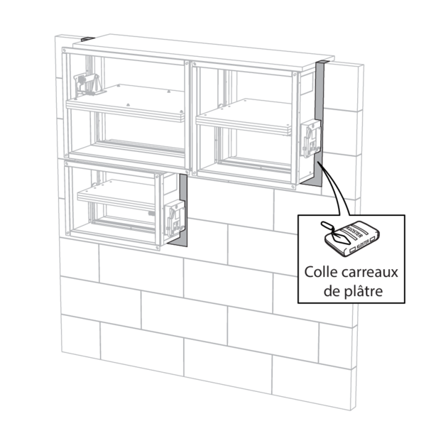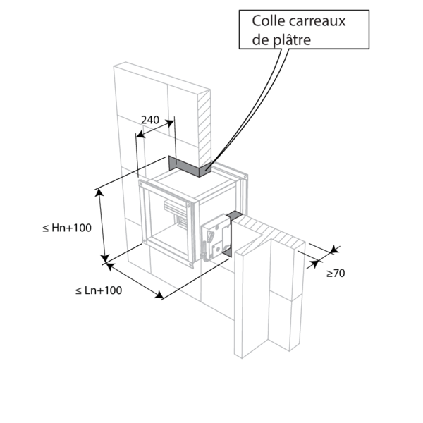 - Carreaux de plâtre ≥ 70 mm | EI 120 (ve i o) S - (500 Pa) | Colle carreaux de plâtre | Type de pose : encastré 0/180°. Distances minimales autorisées. | 200x200 mm ≤ CU2 ≤ 1200x800 mm