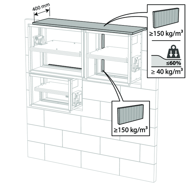 A. Colmatage de la réservation du côté des distances minimales par rapport à une paroi/dalle adjacente ou un autre clapet coupe-feu : des panneaux rigides de laine de roche (150 kg/m³) sont appliqués sur une profondeur de min. 400 mm, dont 150 mm sur le côté mécanique de la paroi. Les panneaux de laine de roche doivent au moins affleurer le mur.