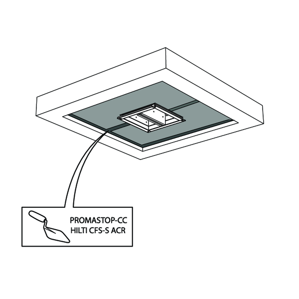 Lorsque le clapet est posé à une distance de 25 mm d’une dalle/plafond, les panneaux rigides de laine de roche à haute densité peuvent être remplacés par de la laine de roche standard (≥ 40 kg/m³, par ex. Rockfit 431), compressée à 40% minimum.