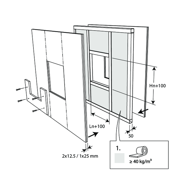 Sur la paroi latérale du clapet, une couche supplémentaire de panneaux de laine de roche enduites est ajoutée en haut, en chevauchant de 100 mm la paroi sur les deux côtés et le haut. Les bords de ces panneaux sont également pourvus d'une couche de pâte coupe-feu.