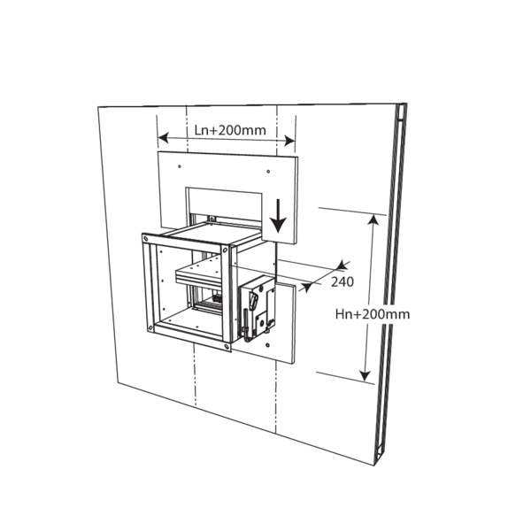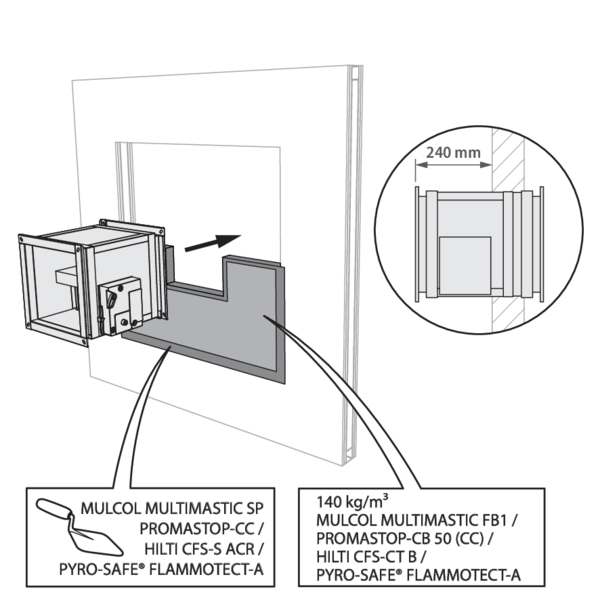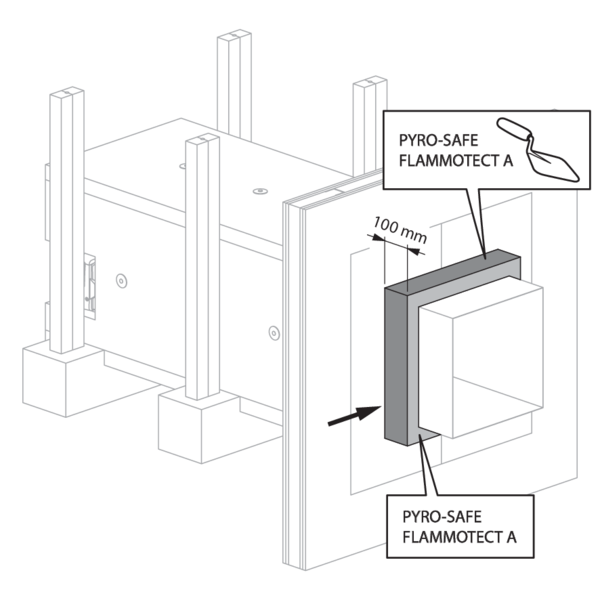 Une réservation de maximum (Ln+600 mm) x (Hn+600 mm) est prévue dans la paroi à travers laquelle passe la gaine de ventilation. La réservation autour de la gaine dans la paroi sera scellée avec une couche de laine de roche enduite de type PYRO-SAFE® FLAMMOTECT-A. Les bords seront scellés avec de la pâte PYRO-SAFE® FLAMMOTECT-A pour assurer l'étanchéité des panneaux.