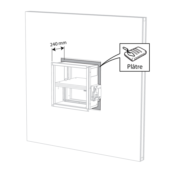 - Ossature métallique et plaques de plâtre Type F (EN 520) ≥ 100 mm | EI 90 (ve i o) S - (300 Pa) | Panneaux de laine de roche + enduit ≥ 140 kg/m³ | Type de pose : encastré 0/90/180/270°. Distances minimales autorisées. | 200x200 mm ≤ CU2 ≤ 1200x800 mm