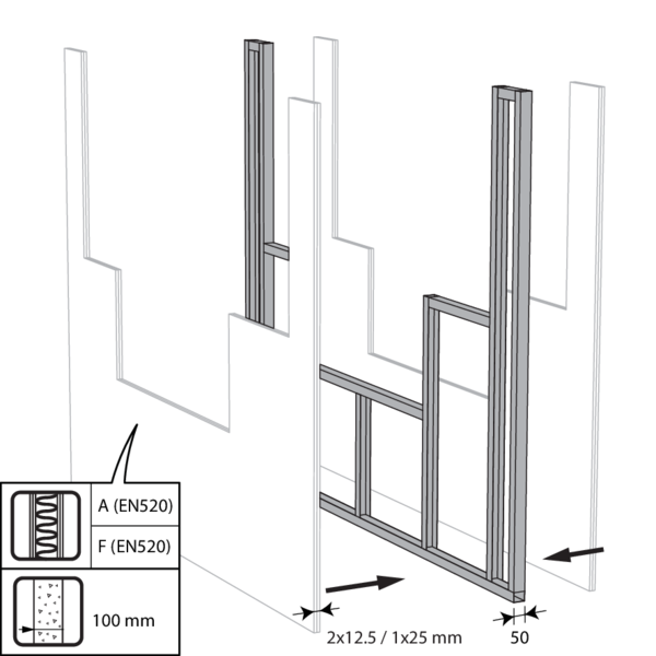 - Ossature métallique et plaques de plâtre Type F (EN 520) ≥ 100 mm | EI 90 (ve i o) S - (300 Pa) | Mortier | Type de pose : encastré 0/180°. Distances minimales autorisées. | 200x200 mm ≤ CU2 ≤ 1500x1000 mm