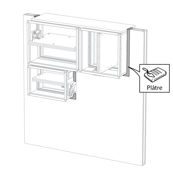 - Ossature métallique et plaques de plâtre Type A (EN 520) ≥ 100 mm | EI 60 (ve i o) S - (500 Pa) | Plâtre | Type de pose : encastré 0/180°. Distances minimales autorisées. | 200x200 mm ≤ CU2 ≤ 1500x1000 mm