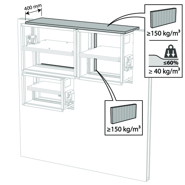 Colmatez la réservation du côté des distances minimales à l’aide de panneaux rigides de laine de roche (≥ 150 kg/m³) sur une profondeur de 400 mm (150 mm du côté mécanique de la paroi).