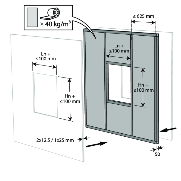 - Ossature métallique et plaques de plâtre Type A (EN 520) ≥ 100 mm | EI 60 (ve i o) S - (300 Pa) | Mortier | Type de pose : encastré 0/180°. Distances minimales autorisées. | 200x200 mm ≤ CU2 ≤ 1500x1000 mm