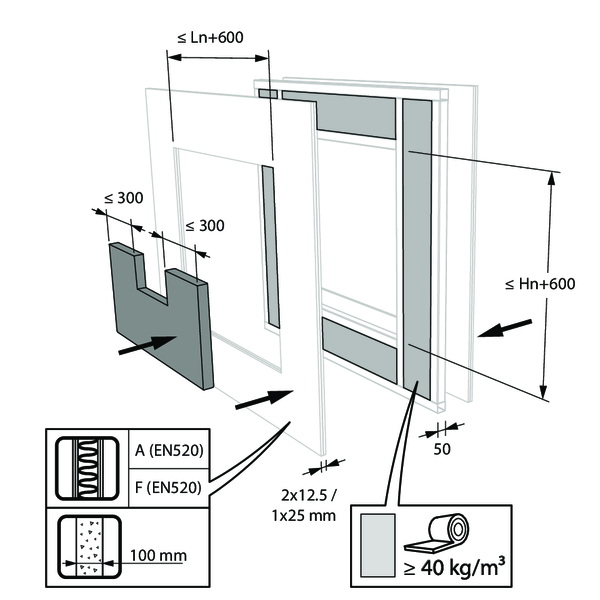- Ossature métallique et plaques de plâtre Type F (EN 520) ≥ 100 mm | E 120 (ve i o) S - (300 Pa) | Laine de roche ≥ 40 kg/m³ + talons | Type de pose : encastré 0/180°. Distances minimales autorisées. | 1200x800 mm < CU2 ≤ 1500x800 mm