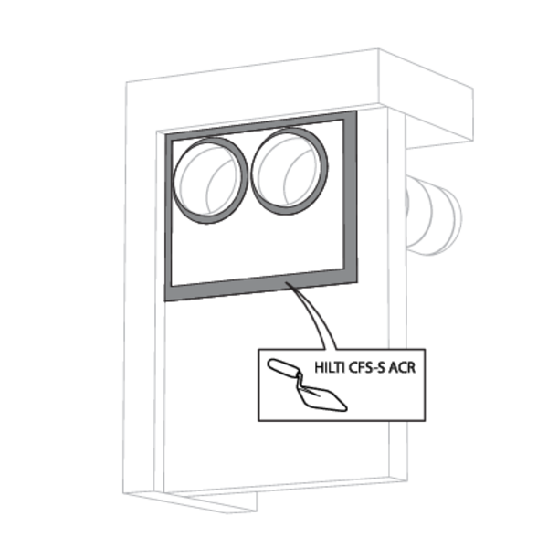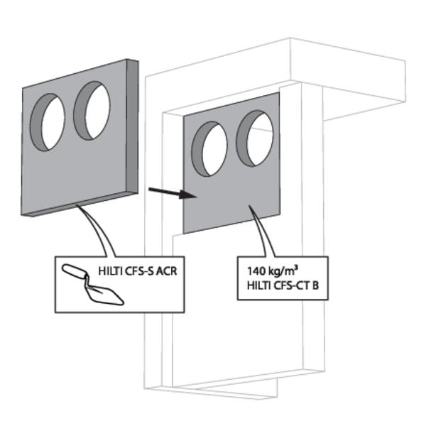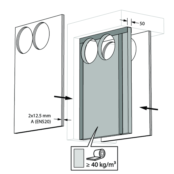 La réservation dans la paroi autour de la gaine isolée est scellée avec 2 panneaux de laine de roche rigides de 50 mm avec couche d'enduit coupe-feu sur une face (type Promastop CB50 / Hilti CFS-CT B).