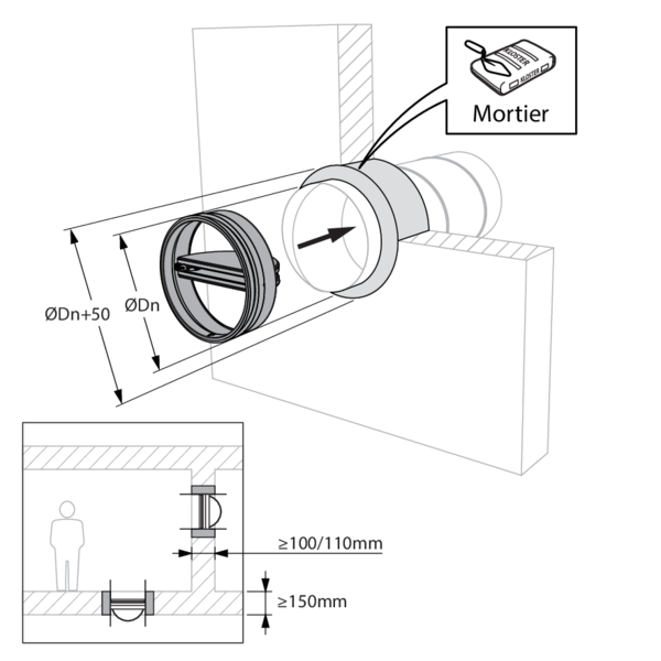 - Béton cellulaire ≥ 150 mm | EI 60 (ho i o) S - (300Pa) | Mortier | Type de pose : encastré en conduit traversant, 0-360° | SC+60 Ø 100-200 mm