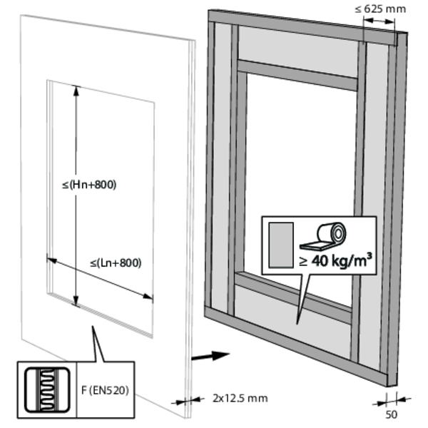 - Ossature métallique et plaques de plâtre Type F (EN 520) ≥ 75 mm | EI 30 (ve i o) S - (300 Pa) | Panneaux de laine de roche + enduit ≥ 140 kg/m³ | Type de pose : encastré 0/90/180/270°. Distances minimales autorisées. | 200x100 mm ≤ CU-LT ≤ 800x600 mm