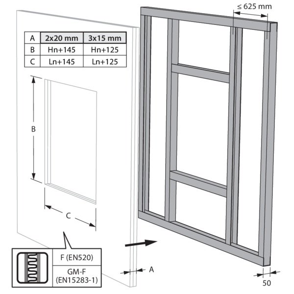 - Lors de l'installation d'un clapet coupe-feu dans une paroi métallique flexible, certaines méthodes d'installation ne nécessitent pas la mise en place de profilés de renforcement autour de la réservation de la paroi du point de vue de la protection contre l'incendie (voir ci-dessous). Il convient de toujours suivre les instructions générales du fabricant de ces systèmes de parois lors de la construction de ce type de paroi.