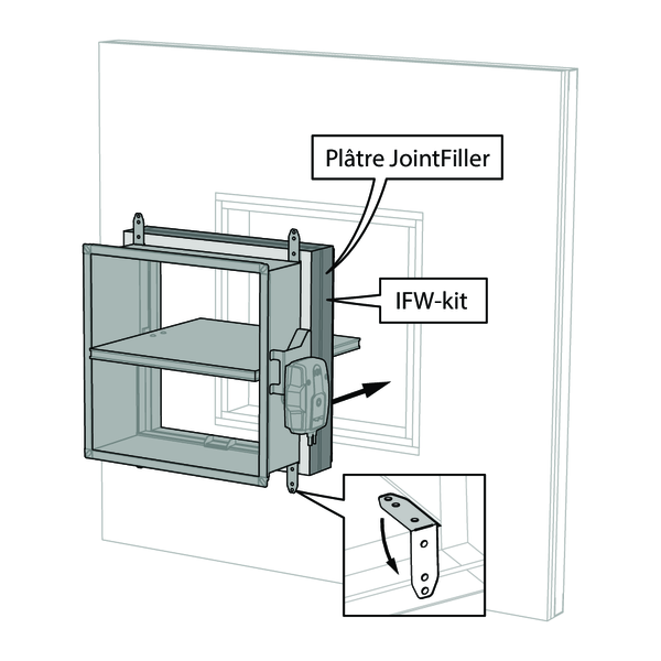 Le clapet est pourvu du kit IFW et monté déporté sur une gaine traversante en tôle d’acier galvanisé. Un supportage est mis en oeuvre au pas de 1500 mm ainsi qu’un supportage complémentaire au niveau de la jonction entre la gaine et le clapet.