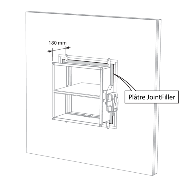 La réservation autour du clapet (en cas d'installation à une distance plus courte, également entre le clapet et la dalle/le plafond et entre max. 2 clapets coupe-feu) est étanchée à l'aide de 2 panneaux de laine de roche rigides de 50 mm. Ces panneaux doivent être posés a joints décalés et ces joints sont recouverts sur tout le contour d’enduit.