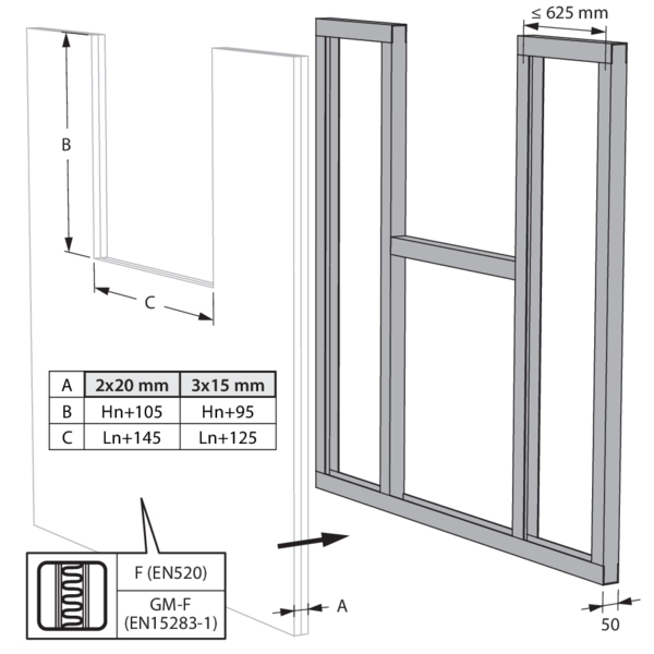 Une réservation de dimensions maximales « A » est réalisée au travers de la paroi. Pour une cloison légère, prévoir l’assemblage de la paroi selon «Montage en paroi flexible et massive - calfeutrement panneaux de laine de roche coupe-feu» ci-avant.
