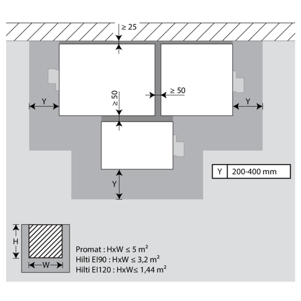 Les clapets peuvent être installés à distance minimale d'une dalle/d'un plafond (≥ 25 mm), d’une paroi ou d’un autre clapet (≥ 50 mm).