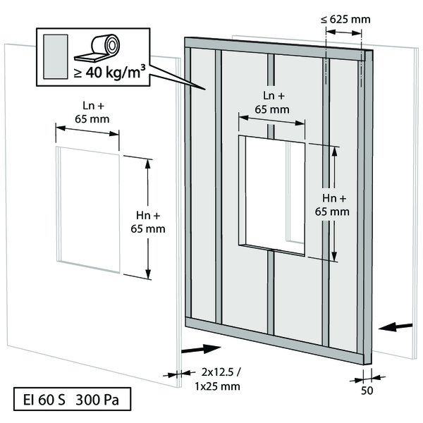 - Ossature métallique et plaques de plâtre Type F (EN 520) ≥ 80 mm | EI 60 (ve i o) S - (300 Pa) | Panneaux de laine de roche + enduit ≥ 150 kg/m³ | Type de pose : encastré 0/180°. Distances minimales autorisées. | 200x100 mm ≤ CU-LT ≤ 800x600 mm