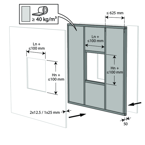 - Ossature métallique et plaques de plâtre Type A (EN 520) ≥ 100 mm | EI 60 (ve i o) S - (300 Pa) | Mortier | Type de pose : encastré 0/180°. Distances minimales autorisées. | 200x100 mm ≤ CU-LT ≤ 800x600 mm