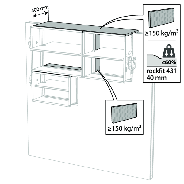 Lorsque le clapet est posé à une distance de 25 mm d’une dalle/plafond, les panneaux rigides de laine de roche à haute densité peuvent être remplacés par de la laine de roche standard (≥ 40 kg/m³, par ex. Rockfit 431), compressée à 40% minimum.