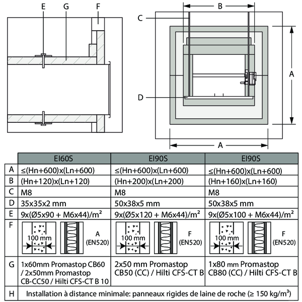 Pour un classement EI60S : les panneaux de laine de roche pré-enduit de type Promastop CB60 ou CB-CC50 peuvent être remplacés par un type similaire de panneau de laine de roche présentant au moins la même classe de réaction au feu, la même densité et la même épaisseur (testé selon EN 1366-3).