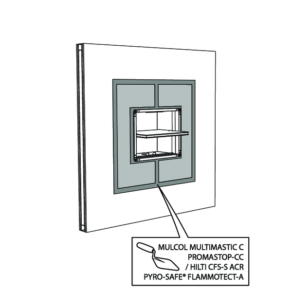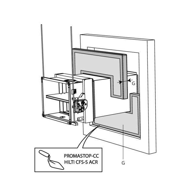 La réservation autour de la gaine dans la paroi est remplie par une épaisseur de panneaux de laine de roche de type Promastop CB(/CC) / Hilti CFS-CT B « G » revêtus sur les chants d’enduit PROMASTOP-CC / HILTI CFS-S ACR permettant leur fixation.