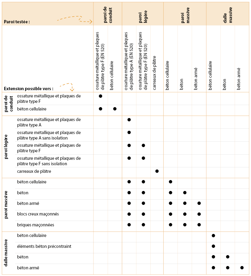 • une paroi massive ayant une épaisseur et une résistance au feu supérieure ou égale à celle de la paroi testée. Le calfeutrement doit ici être le même que celui testé dans la paroi d’essai. L'installateur ne pourra par exemple pas remplacer un calfeutrement en laine de roche par du mortier ou du plâtre (sauf si cette méthode de colmatage a été testée avec succès).