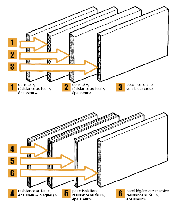 • une paroi flexible sans isolation entre les parements en plaques de plâtre, même si le test a été réalisé avec isolation. La paroi non isolée doit dans ce cas présenter au minimum la même résistance au feu que la paroi testée avec isolation.