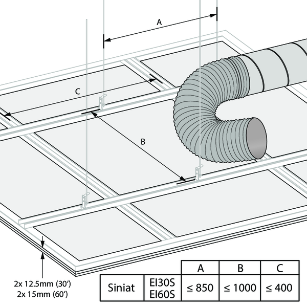 - Les clapets terminaux coupe-feu SC-S testés dans des plafonds suspendus résistants au feu standardisés, de marque Siniat, conformément à la norme EN 1366-2 et EN 1364-2.