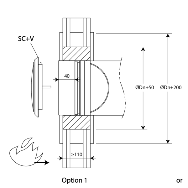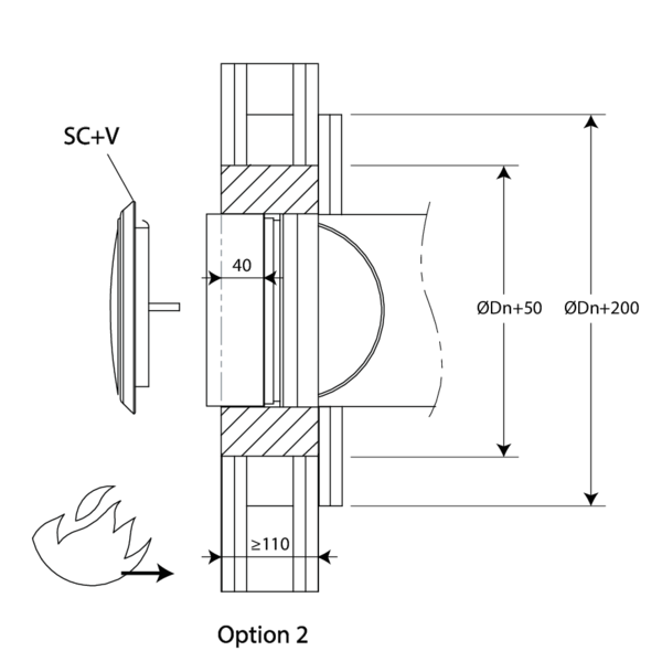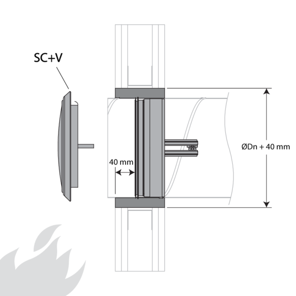 - Béton armé ≥ 110 mm | EI 60 (ve o i) S - (300Pa) | Mortier | Type de pose : encastré en conduit traversant, 0-360°; Côté feu = côté opposé au fusible thermique | SCV60 Ø 100-200 mm